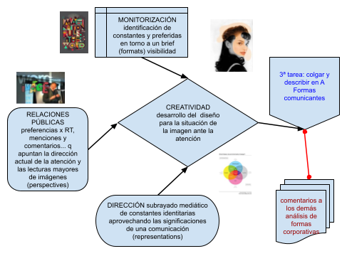 - A) A partir del escenario de comunicación de varias imágenes organizacionales estudiamos sus formas, orientación y posibles interpretaciones desde virales, composiciones, infografías, fotografías, vídeos, estilismo, ambiente de un evento... Para su crítica en la auditoria final de la imagen de una marca, evento, comarca, etc. Desde nociones clásicas de crítica de imagen de otros cursos y aprendizajes (desarrollo de la competencia analítica formal o morfo-sintáctica, parte 2A del documento).